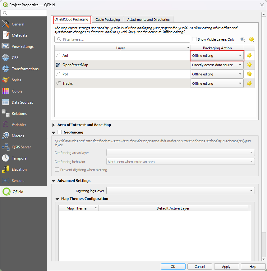 When configuring a project for QField you can choose between the different “Packaging” options.